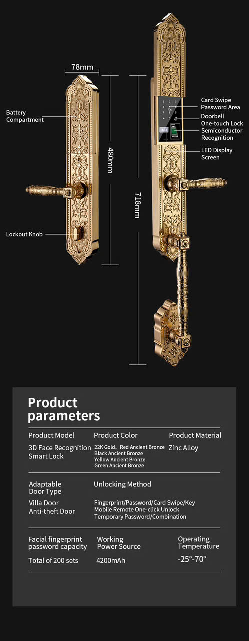 Màu sắc: Vàng Gold Tính năng: 1. Chìa cơ 2. Thẻ chip 3. Cảm biến vân tay 4. Mã số 5. App TT Lock hoặc JLink - Thời gian bảo hành sản phẩm: 02 năm - Báo giá (nêu trên) đã gồm chi phí vận chuyển đến Nhà phân phối.